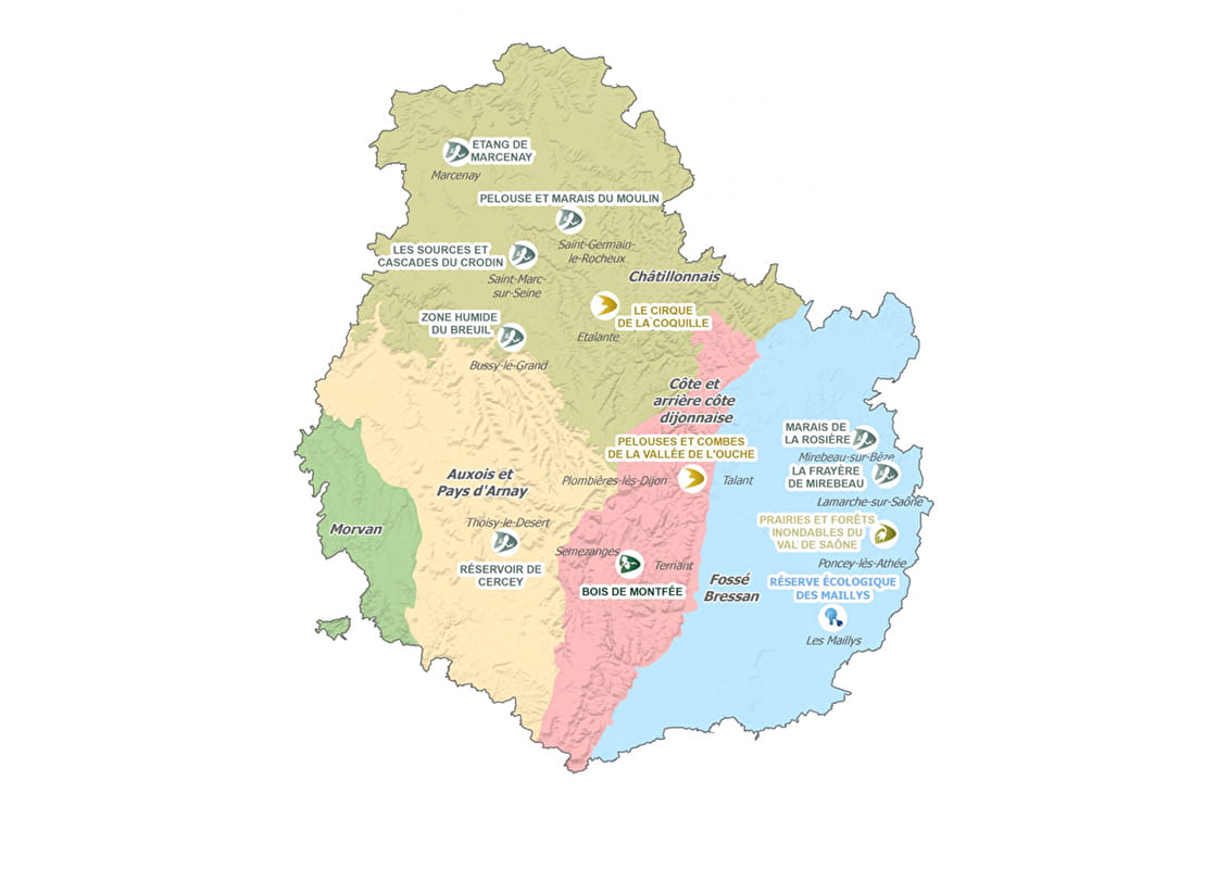 Les sites qualifiés d'Espaces Naturels Sensibles (ENS) de Côte-d'Or sont situés aux quatre coins du département. Ils peuvent ainsi être des mares, des étangs, des rivières et leurs abords, des milieux humides, des forêts, des landes, des prairies, des pelouses sèches, des grottes, des rochers, des éboulis ou encore des falaises.